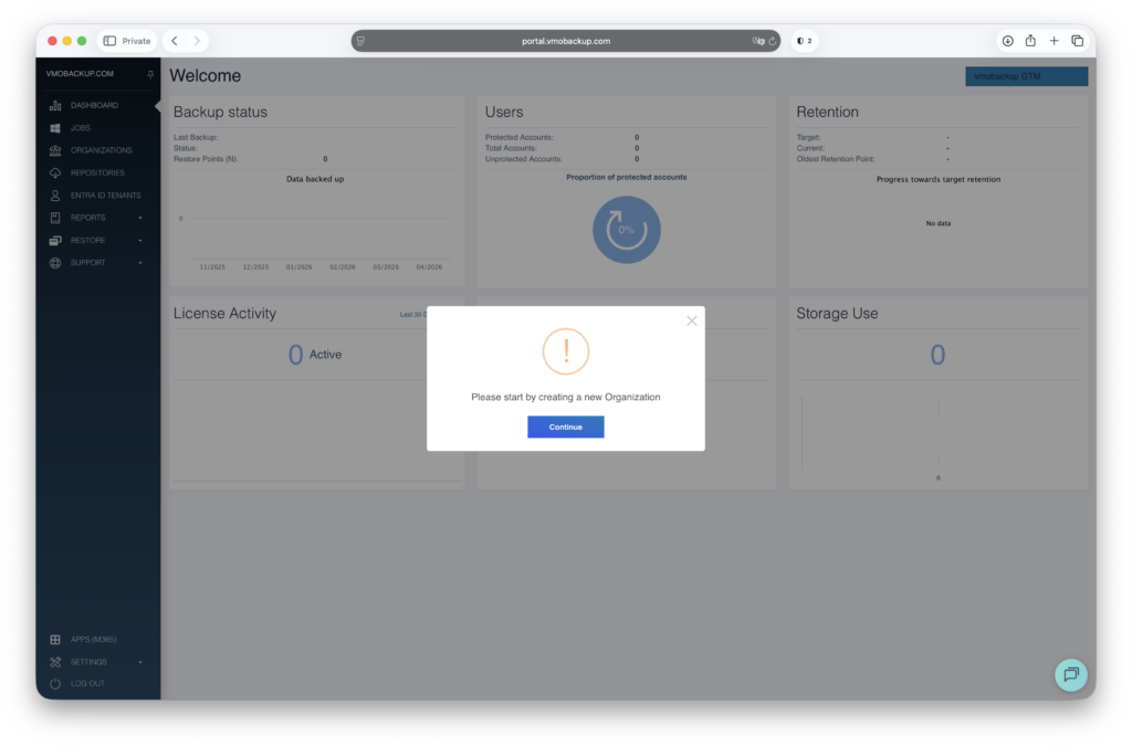 VMOBACKUP provides a guided setup wizard for configuring Microsoft 365 backups.