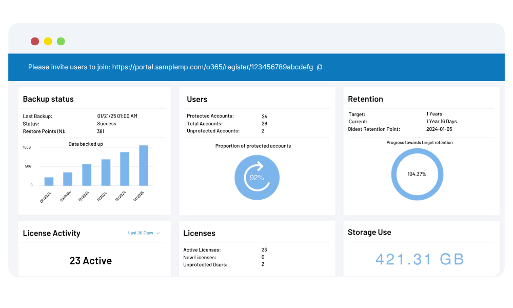 Quickly link each customer’s Microsoft 365 environment and configure backup jobs with built-in guidance. You’ll have everything you need to protect client data and prove it’s recoverable, all in one place.